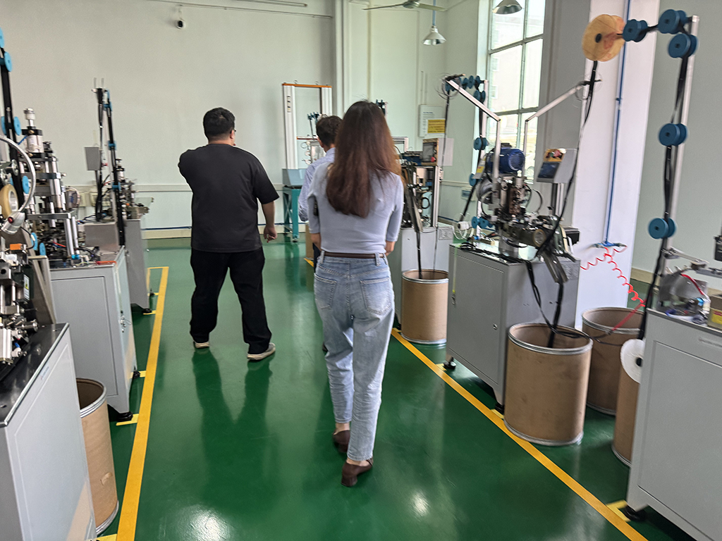 بعد إلقاء نظرة أولية على كتالوج الآلات في المكتب، قاد مدير التجارة الخارجية العملاء إلى قاعة العرض لزيارة سلسلة مختلفة من آلات السحاب مثل المعدن والنايلون والبلاستيك، وأعطى العملاء مقدمة مفصلة عن جودة وأداء منتجاتنا.