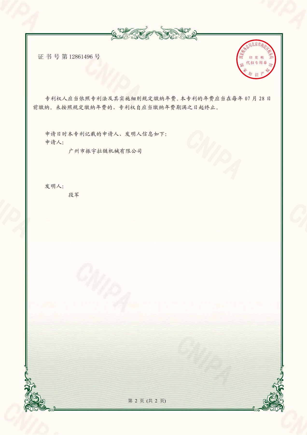 Certificate Of Chain Passing Structure And Chain Feeding Device Of Slider Mounting Machine