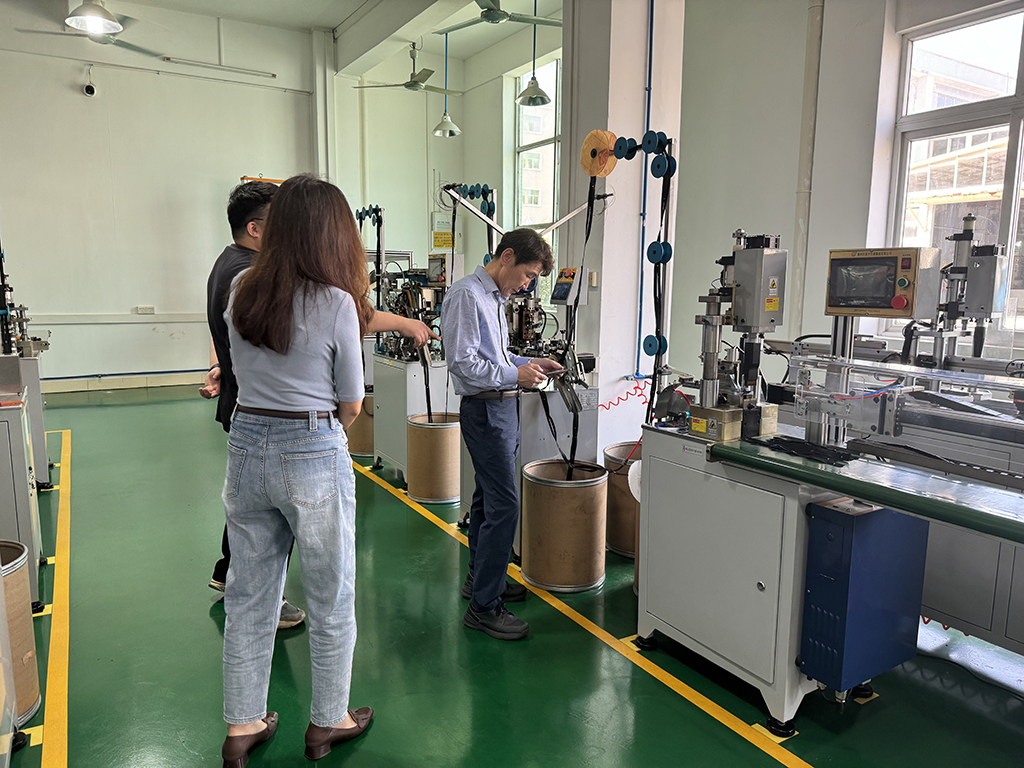 Después de mirar inicialmente el catálogo de máquinas en la oficina, el gerente de comercio exterior condujo a los clientes a la sala de exposiciones para visitar varias series de máquinas de cremallera, como metal, nailon y plástico, y les dio a los clientes una introducción detallada sobre la calidad y el rendimiento de nuestros productos.